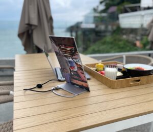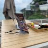 A single USB-C cable acts as a 4-Lane Highway, simultaneously transporting "Fuel" (Power Delivery) and "Heavy Cargo" (DisplayPort Video Protocol), turning a seaside breakfast into a powerful mobile workstation.