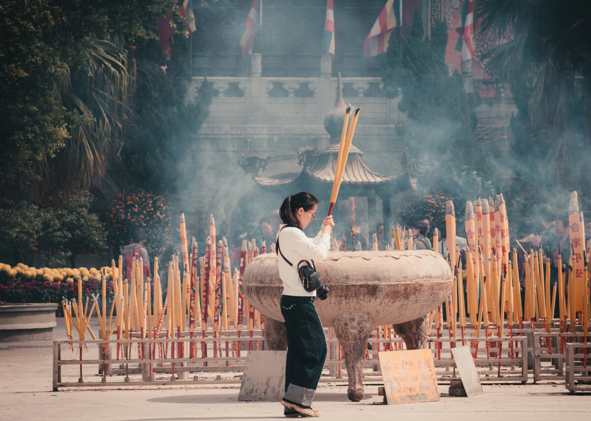 A serene scene of traditional rituals at the temple, where incense offerings fill the air, symbolizing deep devotion and culture.