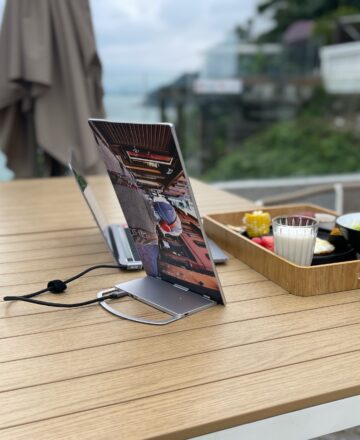 A single USB-C cable acts as a 4-Lane Highway, simultaneously transporting "Fuel" (Power Delivery) and "Heavy Cargo" (DisplayPort Video Protocol), turning a seaside breakfast into a powerful mobile workstation.